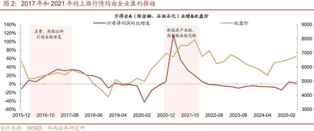 例如2016-2017年,消费和周期品种业绩显著修复,驱动企业盈利持续回升,股价大涨。其中,消费品种业绩受益于2017年居民人均可支配收入的回升,周期品种业绩则受到供给侧结构性改革的推动。而在2020-2021年,A股同样迎来一段由部分企业盈利推动的牛市。当时新能源产业在政策支持下蓬勃发展,光伏、新能源汽车、电网设备等行业业绩显著增长,同时全球经济复苏带动需求回升,推动大宗商品价格大幅上涨,对应周期股业绩回暖。