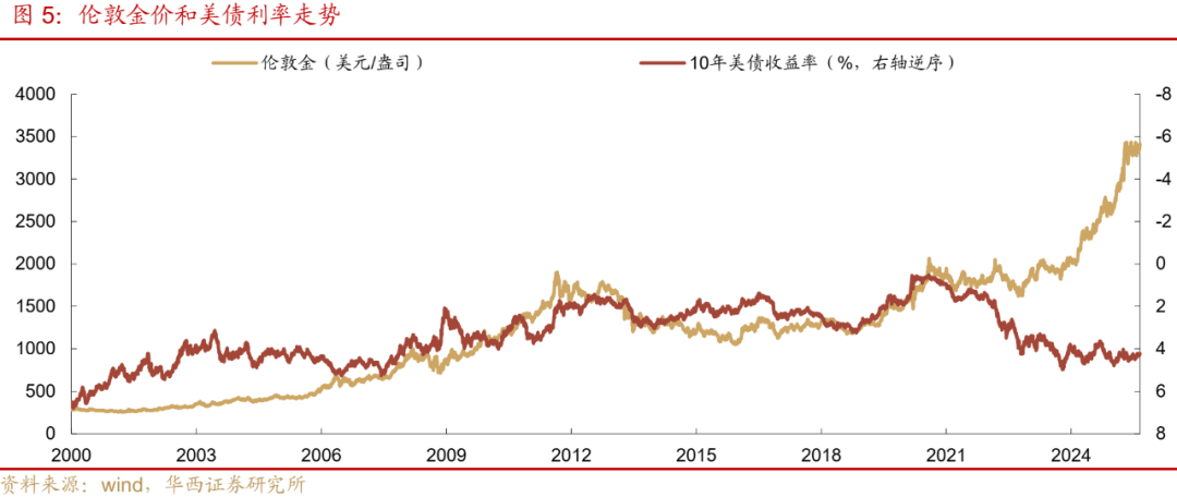 黄金过去的定价,与美元实际利率负相关。当美元实际利率较高时,投资者更倾向于持有美元资产,而减少黄金的持仓,对应黄金需求减少,价格下跌。最近几年,尤其是2020年之后,黄金和美元之间的关系变为正相关。其背后是美元作为避险资产的地位,正被动摇。未来驱动黄金价格继续创新高的因素,或已不再是美国降息等传统因素,更多来自于黄金替代美元及美元类资产,成为无风险资产的代表。