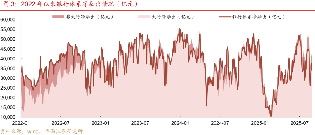 如何判断资金利率是否平稳,银行融出或是最直观的指标。对资金市场而言,大部分时间,供给变化往往具备更强的话语权,这一特征主要源自价差(Carry)天然的无风险套利属性,如果供给异动导致资金利率出现变化,需求端则会相应调节杠杆程度。而在一众资金供给指标当中,银行体系净融出规模或是最值得高频跟踪的变量。