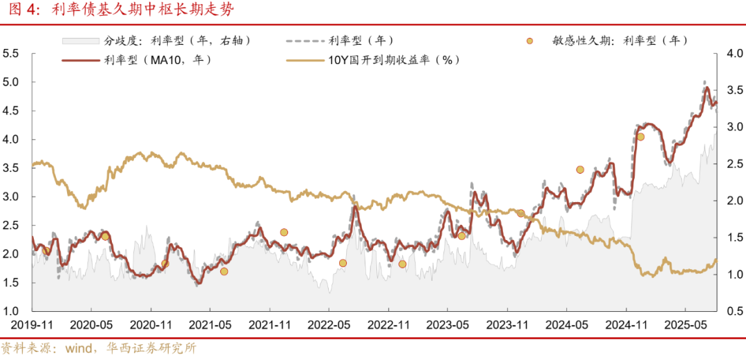 这其中,基金久期多变且显性化,是我们判断市场节奏的关键。利率型公募债基,久期的变化也相对灵活,博弈久期是其核心策略。当其久期中位数比较高时,往往体现出交易盘较为一致的乐观预期,满仓待涨反而可能成为市场最大空头力量。因为看多预期已经打满,这时候市场会对利空信息敏感,久期高位久盘不再拉升,就可能被迫下降。所以利率债基久期高位徘徊之时,释放的可能是风险信号。例如2025年2月末至3月初期间,10年国债收益率虽已出现“M顶”信号,但由于市场久期中枢普遍处于偏高水平,后续稍有风吹草动,浮亏的压力便可轻松瓦解市场的做多预期,直至3月中旬市场完成系统性久期压降后,债市才真正企稳。同样当市场预期非常悲观时,基金的久期可能也已经处于相对低位了,这时候变得对利多敏感,久期拉升的过程会推动利率加速下行。